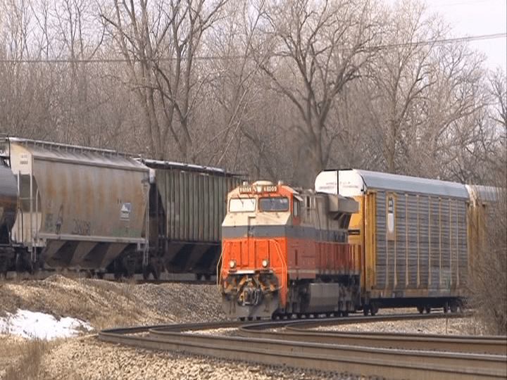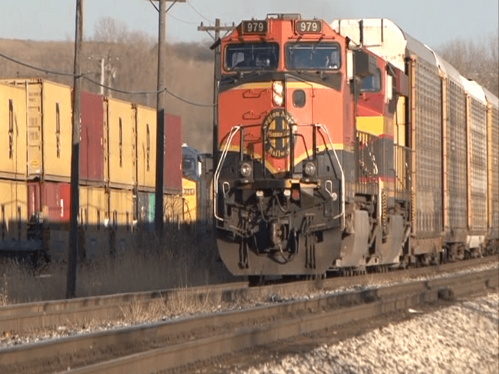 BNSF 979 and KCS 4680 with auto racks at Cottage Grove. That CSX stacker travels the opposite direction.