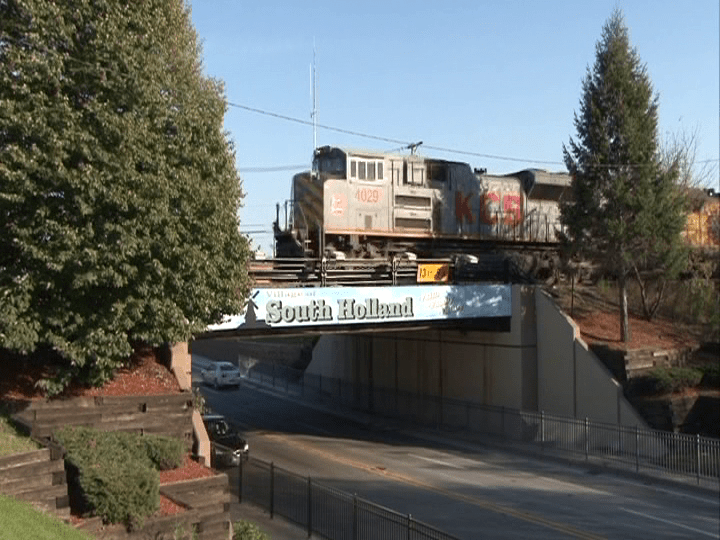 Leaving Yard Center. Kansas City Southern powers a Union Pacific train on a street overpass at South Holland.