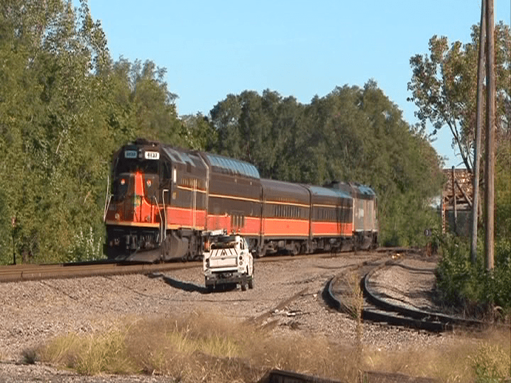 A stand-in for the Amtrak Hoosier. Note the Illinois Central style paint on the passenger cars. A matching Iowa Pacific loco brings up the rear.