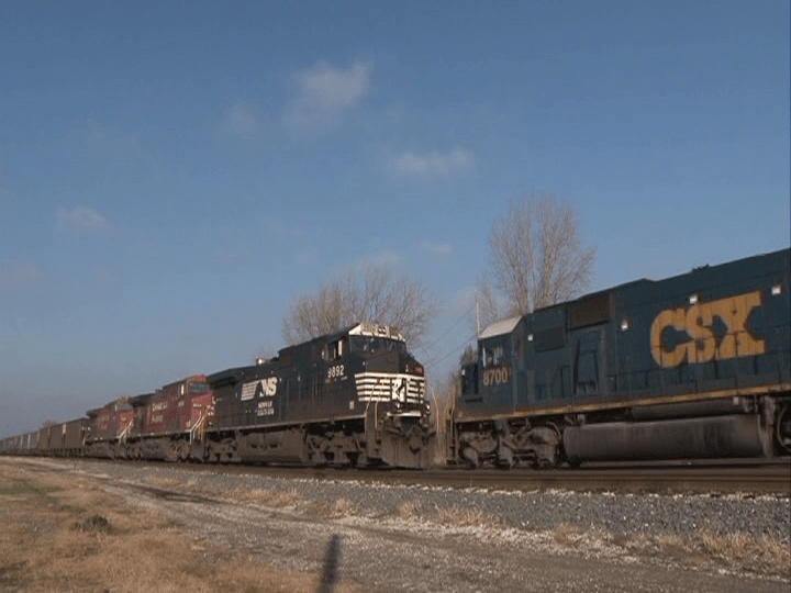 At busy Hohman Avenue. NS 9892 fronts a pair of Canadian Pacific units. CSX leader 8700 charges in with a light power move, displaying the hotspot nature of this place.