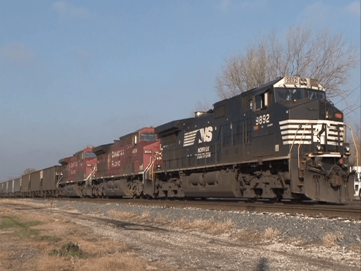 At busy Hohman Avenue. NS 9892 fronts a pair of Canadian Pacific units. CSX leader 8700 charges in with a light power move, displaying the hotspot nature of this place.