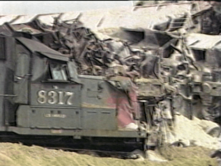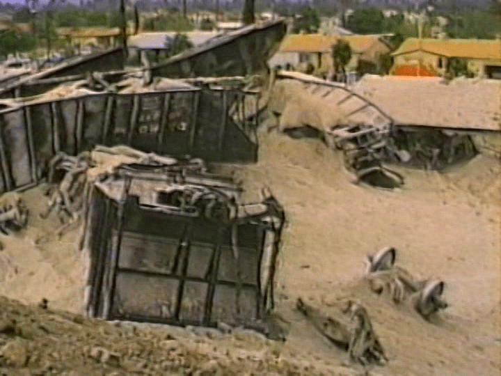 True event. An out of control Southern Pacific train wreck in San Bernardino, California. This occurred on May, 12 1989. A 69 car Potash Train lost brakes while traveling downhill. Estimated speed was in excess of 100 mph when it detailed on a curve rated for 30 mph.