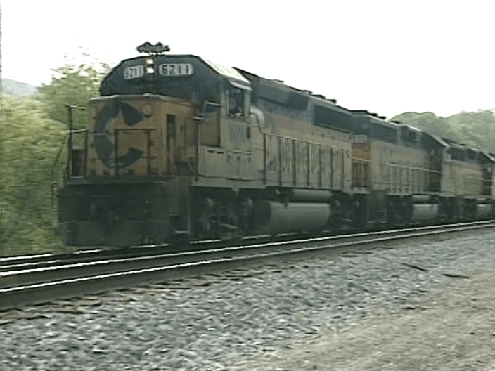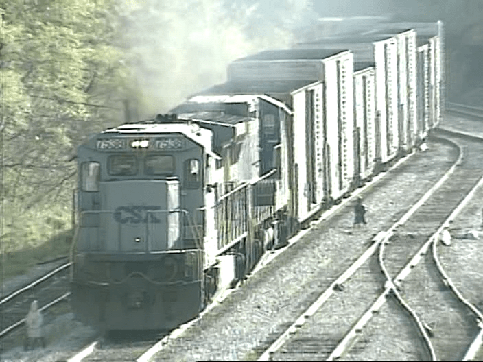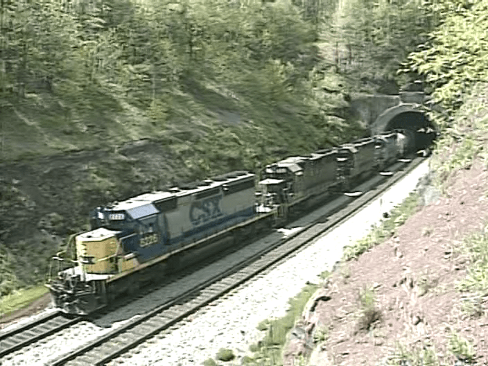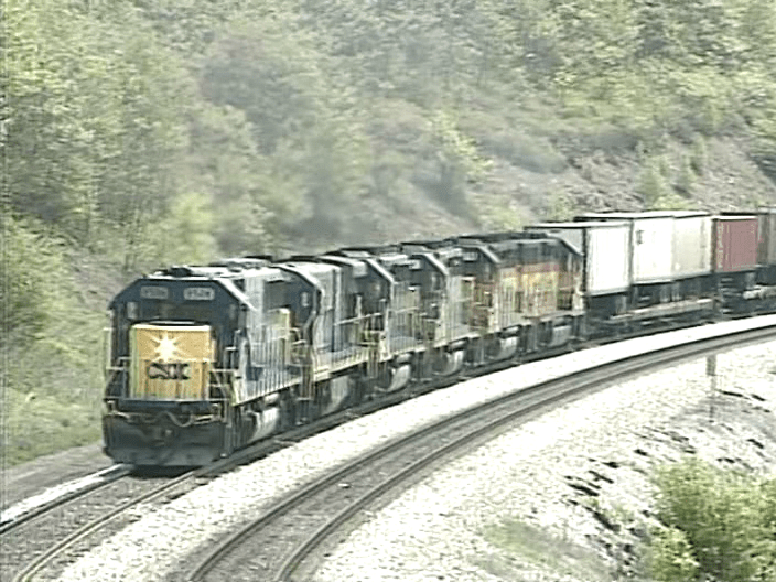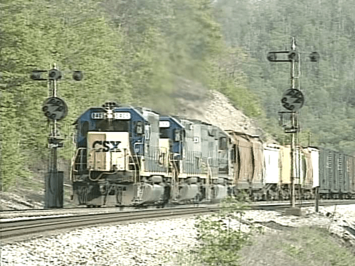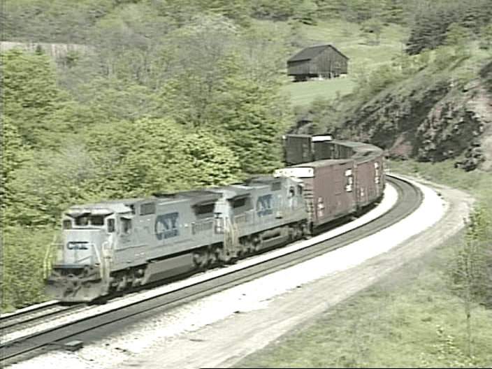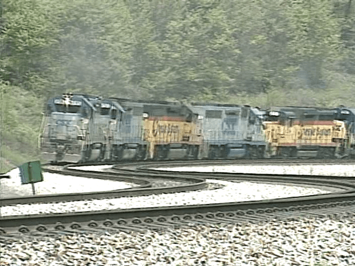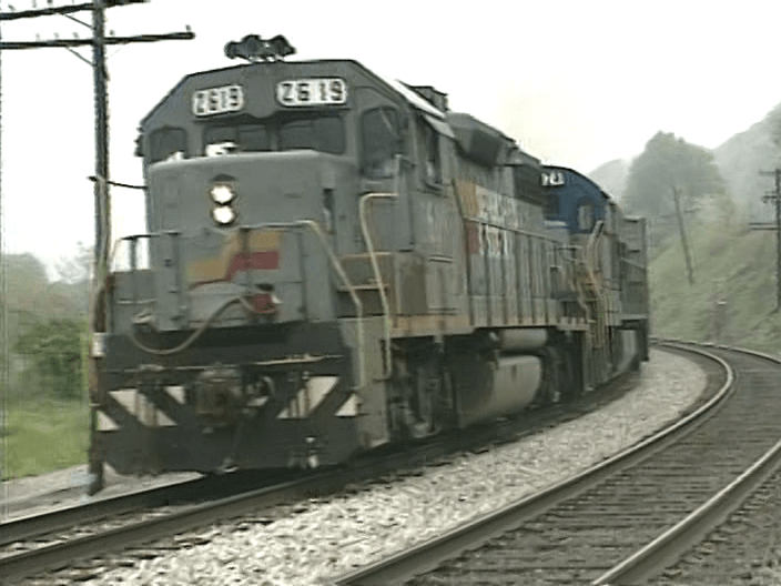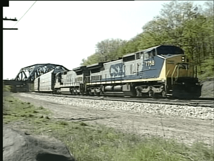 Begins at Keystone. CSX 7758 (C40-8W) leads a freight. GE power dominates the initial trains. The Western Maryland bridge is in the background.