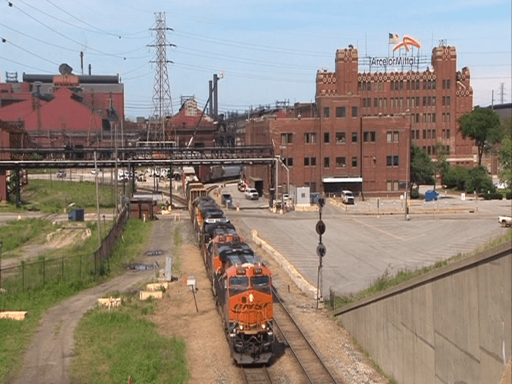 Begins at Klein Avenue CP100. BNSF 7074 leads on Train NS 31K fom this overpass view. Heavy industry is a Hallmark of this part of the Calumet area. Arcelor Mittal is in the background. It is a multi-national steel company.