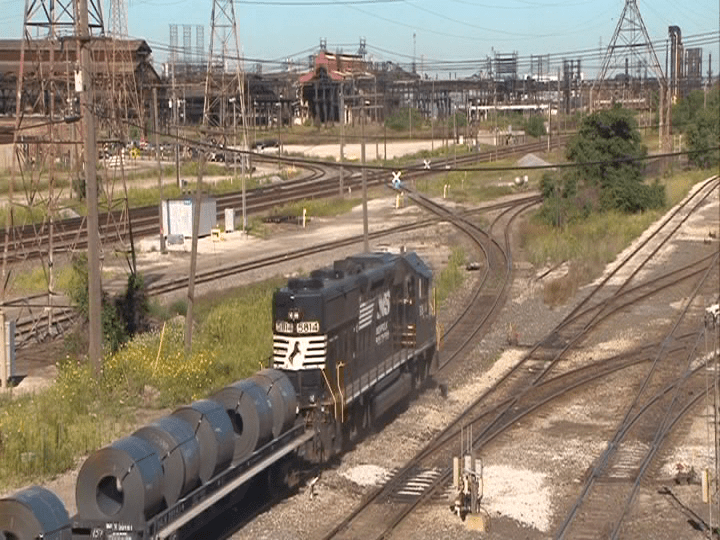 Arcelor Mittal Steel Mill at Indiana Harbor. More trains and Arcelor Mittal switching seen. Hot metal bottle cars, as well. Norfolk Southern 5814 pulls coiled steel cars. Mainline traffic on the NS Chicago Line (left) even sees Amtrak.