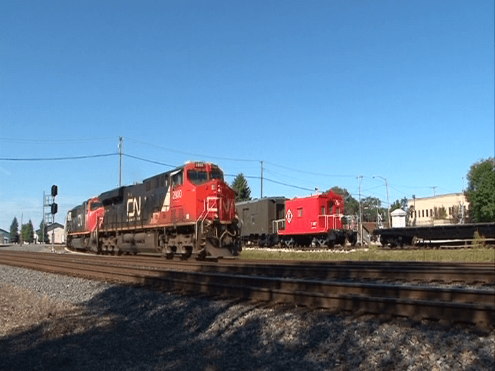 CN 2800 leads a freight past the small train museum at Griffith, Indiana.