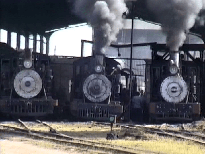 Three Baldwin narrow gauge 2-8-0 locomotives. The power gets ready for the days chores. Engines 1321, 1355 and another are at the shed. Number 1321 is a Baldwin built in 1913 and pulls out first.