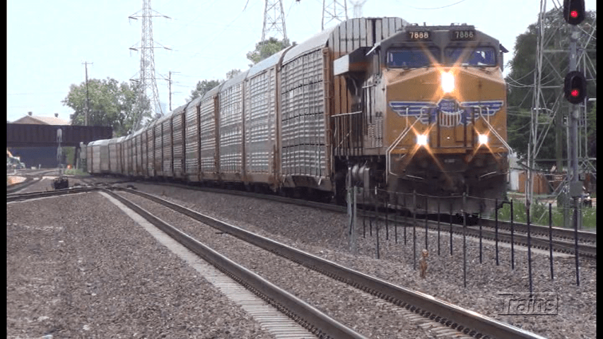 CREATE Projects emphasize upgrades on trackage and traffic in the Chicago vicinity. Improved efficiencies and eliminate grade crossings. Union Pacific 7886 hauls auto racks through Bellwood. CREATE project added new trackage here. Also, a flyover was constructed to connect with Indiana Harbor Belt.