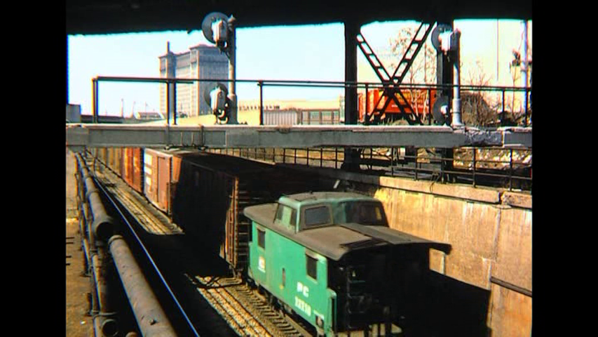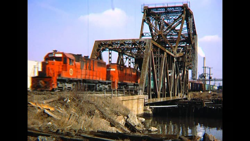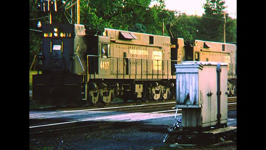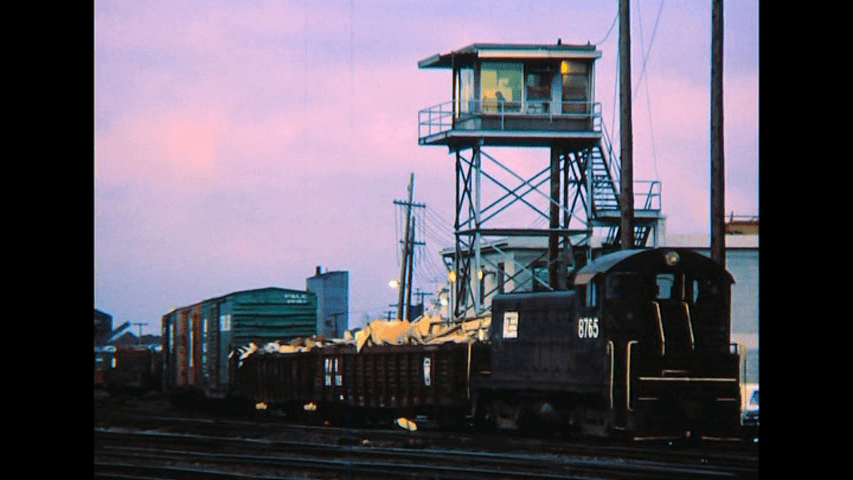Begins in Spring 1973. Various moves. Here, a Penn Central Electromotive switcher 8765 works in the hump in Junction Yard in Dearborn, Michigan. Locomotive call-out errors. This is not an S-2 or S-4. There are more mistakes.