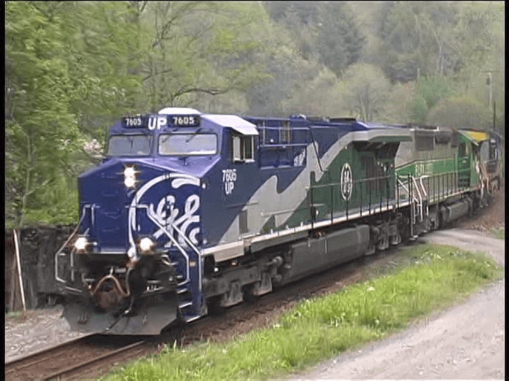 GE demo as UP 7605 leads a CSX grain car move (G-982) near Toecane, North Carolina. Still on ex: Clinchfield trackage.