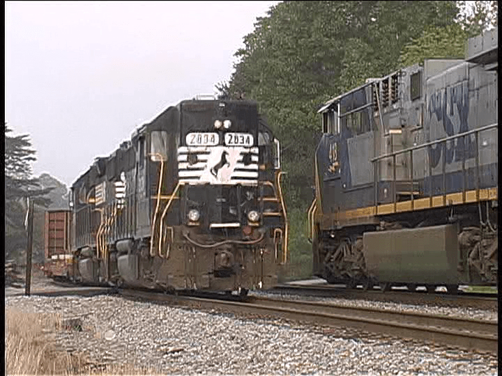 Now on Norfolk Southern and in Virginia. The CSX N-308 train yields to a Norfolk Southern local behind a NS 2834 (GP38).