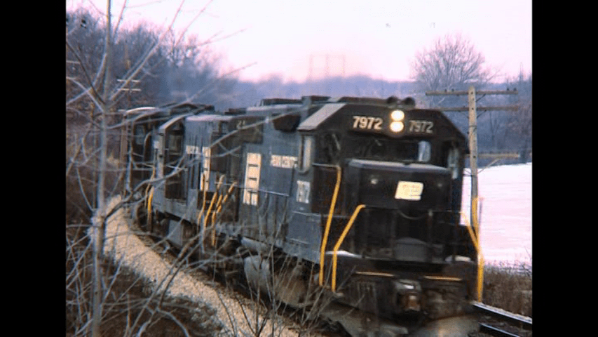 PC 7972 is a GP38-2. Running next to the frozen Huron River. Ypsilanti.