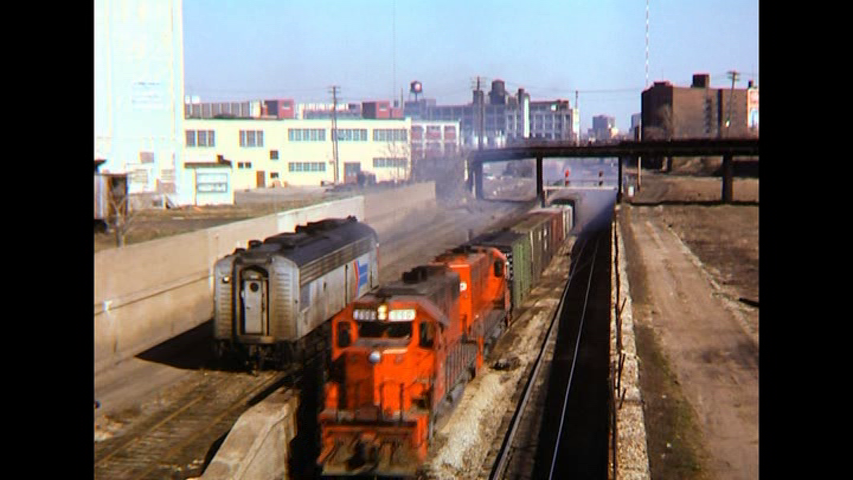 At 40 minutes there are normal train sounds. Westbound at Dearborn behind a GP38-2. PC 7978 leader.