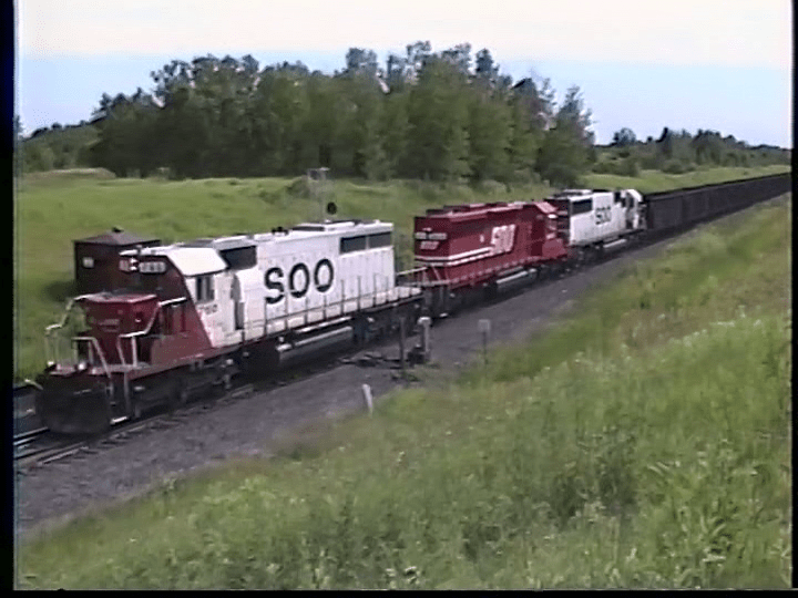 A Wisconsin Central move consisting of ex: Clinchfield hoppers is hauled by three SOO locomotives. Going for taconite pellets.