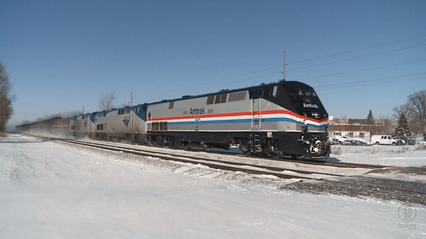 BNSF Staples sub runs diagonally across the State. This is a former Northern Pacific line. Amtrak’s Empire Builder with engine 145. Check the phase 3 painted locomotive. The lash-up includes 173/ 89 as trailing engines. It blasts by while kicking up snow doing about 80 mph at Ramsey.
