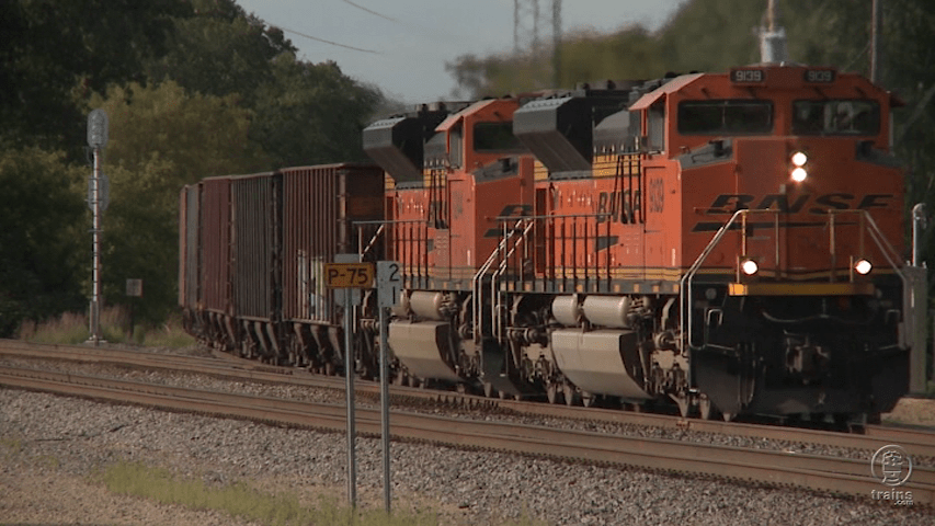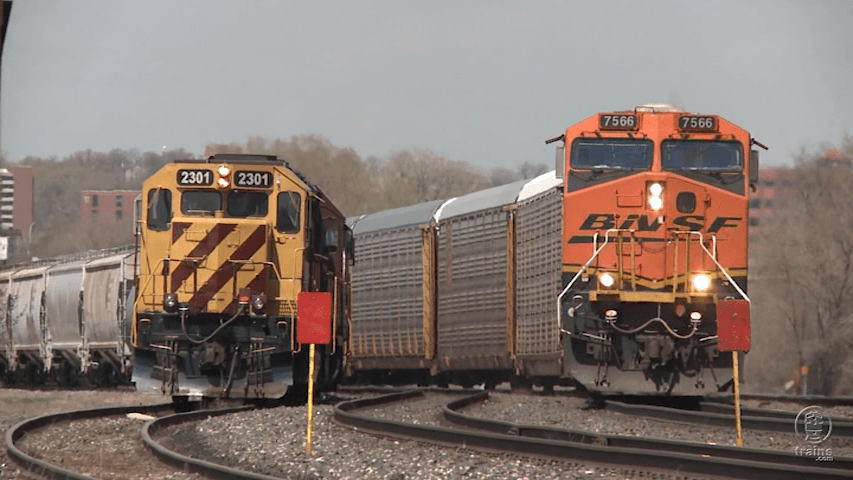 Twin Cities Hot Spots. Minneapolis- St. Paul and Coon Rapids. Starts on former Burlington Route and Milwaukee Road tracks. BNSF 7566 leads auto racks past a standing Twin Cities & Western freight with #2301 in front.