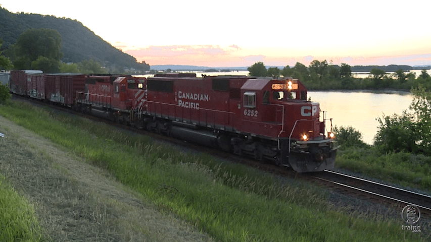 Canadian Pacific runs along the Mississippi River. CP 6252 (SD60) is ex: Soo Line, and CP Rail 5750 (SD40) with general freight. Routed from St. Paul, Minnesota to Bensenville, Illinois.