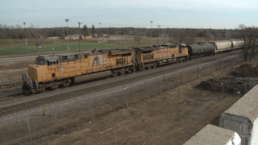 UP Train YSPBN is led by UP 7845/ 7222. A Union Pacific Transfer from South St. Paul to Northtown Yard. Assorted trains roll by at Bandana Square in St. Paul.