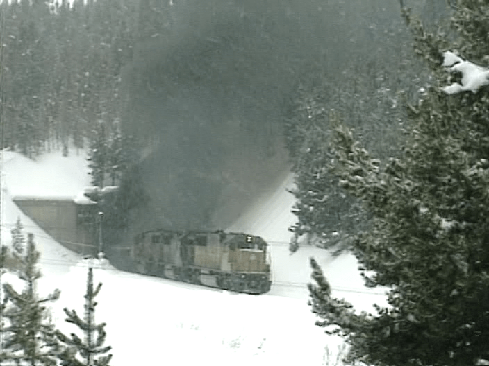 Diesel exhaust pours out of the tunnel. The summit is at over 10,000 feet in elevation. Union Pacific 6010 fronts this Westbound freight during a snowstorm.