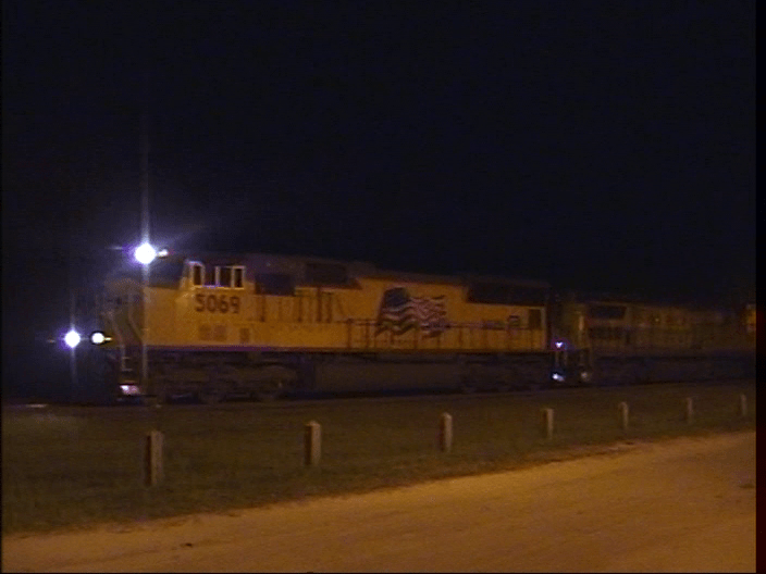 Night photography is supported by lights at the Railfan Park. A Union Pacific freight has a sizeable lash-up of Armour Yellow diesels. Q-555. The seven units are led by an UP SD70M. Maybe the narrator went to bed. Only information at night are the subtitles for the passing traffic. Yawn…