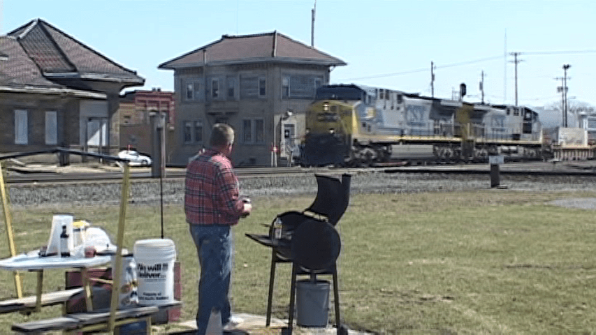 April 2, 2008. Grilling chicken and watching trains roll past on a Spring day at Crossroads Park. A Railfan favorite!