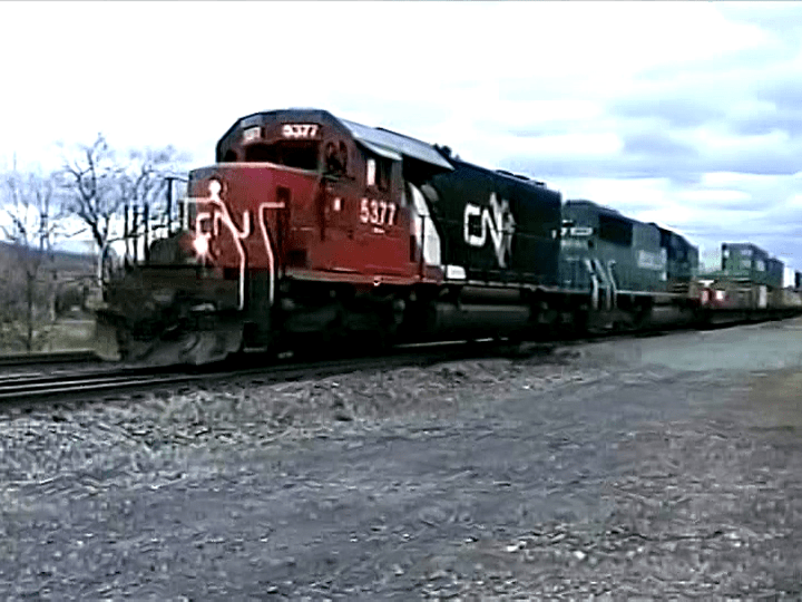 Train Q621 is a Manifest from Selkirk to Massena. CN 5377 leads with an ex: Conrail loco as they haul through Rotterdam Jct. Milepost 39.5. A nice assortment of trains and some more foreign power are shown here. Traffic level seems heavy here.