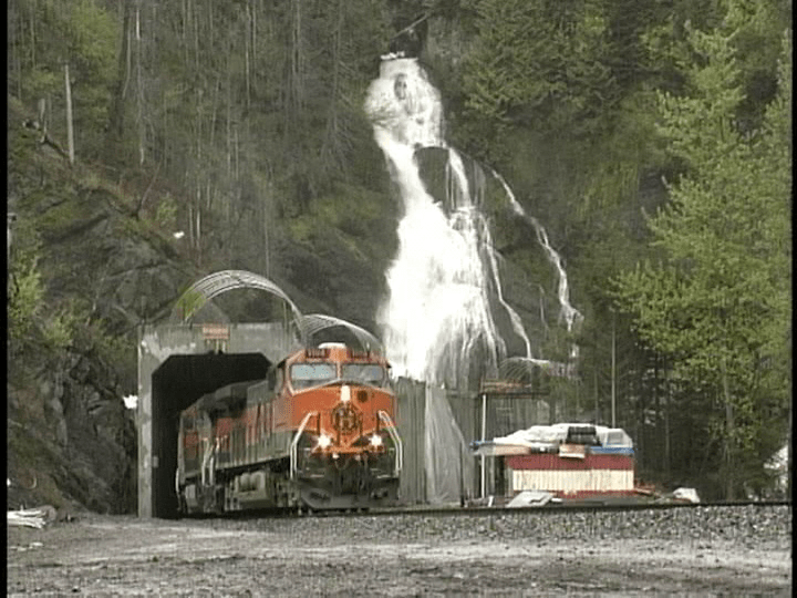 Train 1105 Eastbound exits the Stampede Pass tunnel. DPU power is tested with unit 1086 back in the consist. A concrete snowshed protects the line from the waterfall.