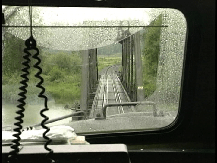 Cabride aboard the Dash 9 locomotive. Bridge crossing at the Green River. Incidentally, the EMD plate inside the cab has a manufactured date of 1996. Rain is frequent on the route. This show ends at Auburn.