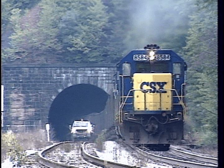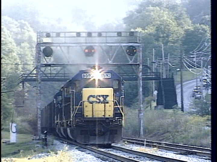 Here is a good scene for the Model Railroaders. The old B&O signal bridge, overhead walkover and a mountain road combine plenty of interest in a single scene. CSX 8593 then passes an old depot and small freight house. The location is Tunnelton, WV.