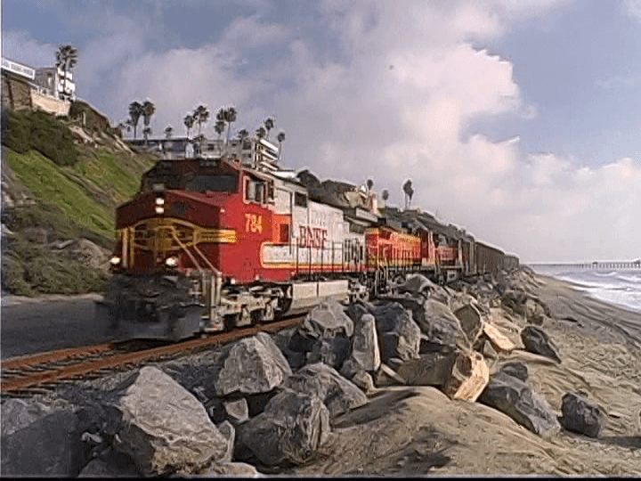 BNSF 784 is a relettered ex: Santa Fe Warbonnet on a freight . North of San Juan Capistrano. Note the pier in the background. By the way, there are only a few freight trains in this program.