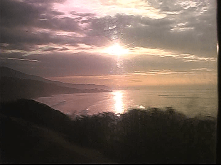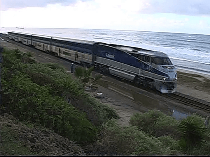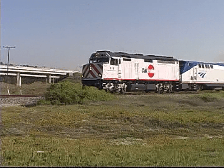 A sunrise as viewed from aboard a Surfliner. There is an abundance of scenes filmed from aboard the Amtrak trains.