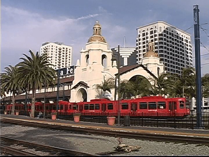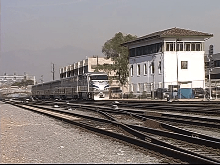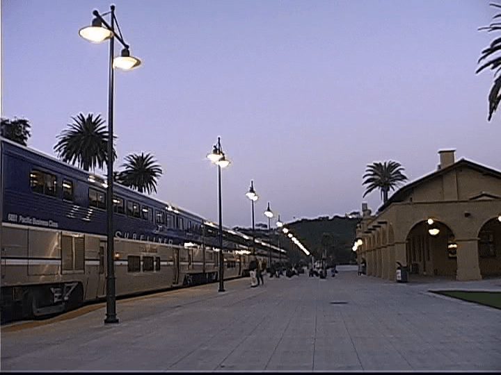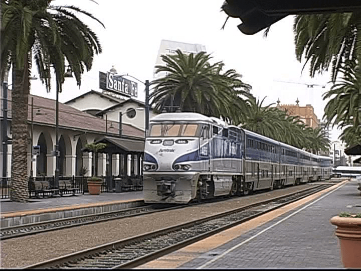 Begins in San Diego with various passenger moves. Amtrak Surfliner departs the Santa Fe Union Station in San Diego, California. Train 771 is departing Northbound. An F59 for power is #465. A look at the interior of this beautiful restored passenger station.