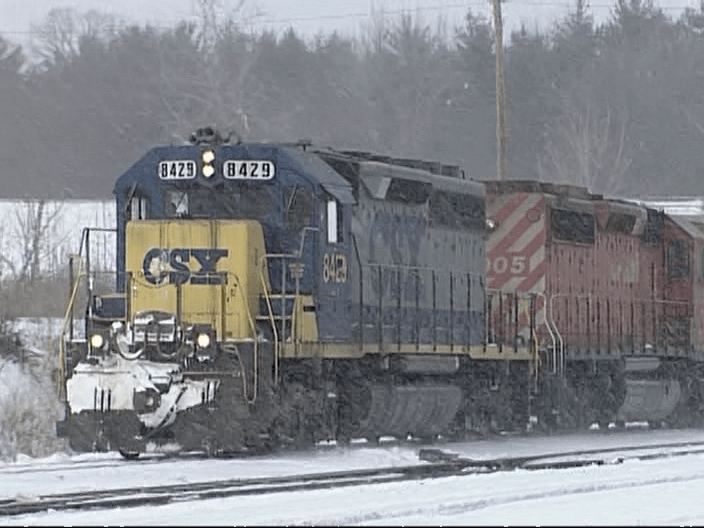 Finally, relocates to SK Junction at 10:55 am. A tiny bit of narrative explains the situation. Much better without all the traffic noise. There is snowfall now. Engine 8429 leads CP Rail 5905.
