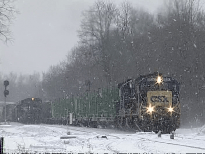 This is 12:20 pm. The narrative comes to life for a brief moment. Two trains are backed up off the Boston Line. CSX 5830 advances first. A Conrail powered train waits for clearance.