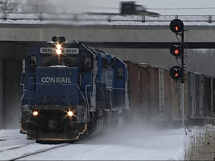 Relocates to the other side of the bridge at SK Junction. Timestamp 3:15 pm. Conrail painted (CSX 8834) leads a mixed freight.