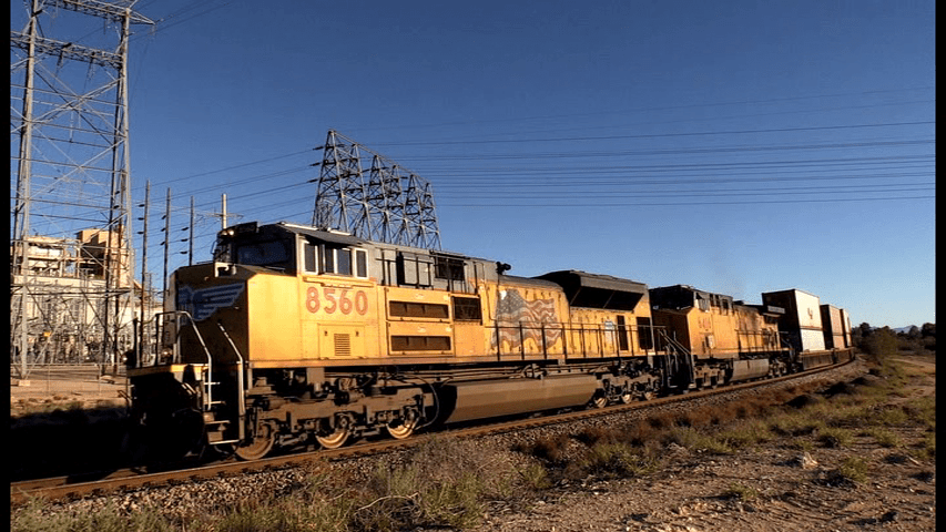 UP 8560 (SD70ACE) and 6416 (AC44-CW) slows for a red signal at the Tucson Electric main generating station with a Westbound double-stack. Milepost 990.
