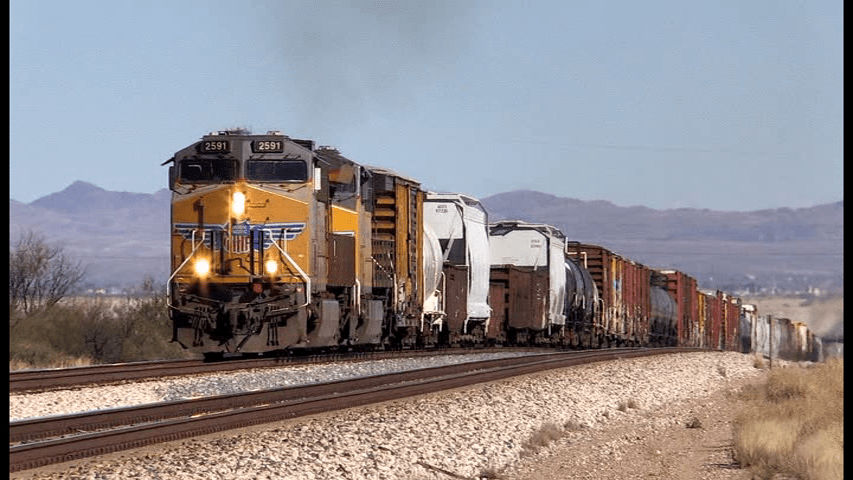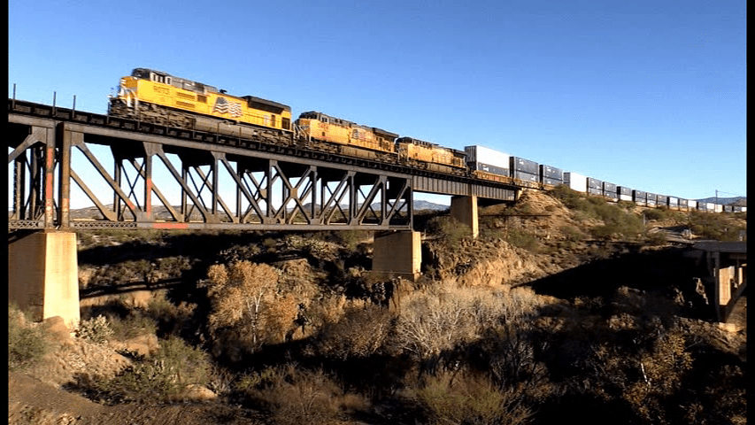 This scene displays some of the beauty which is the vast Sonoran Desert. The trio of Union Pacific locomotives are hauling a very long Intermodal. Freights can range in the 2 to 3 miles in length!