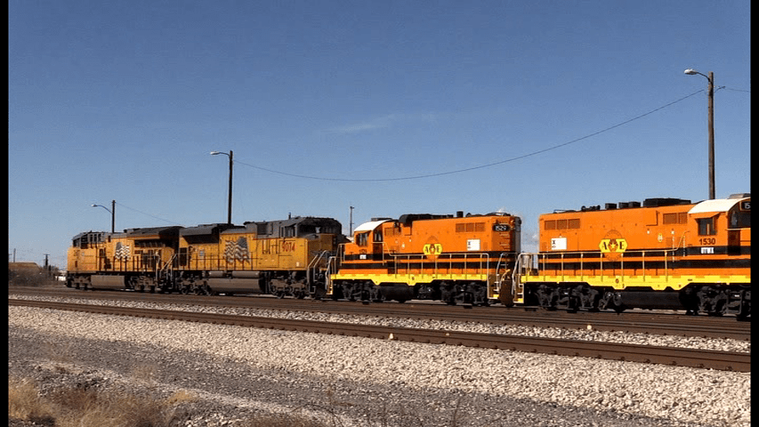 A nice sideview of 2607/9074 creeping with two Arizona Eastern GP8 units in Lordsburg Yard. Check the size difference between the early and modern diesels.