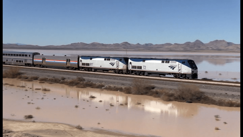 Amtrak engines 72 /816 speed through the Alkaline Flats.