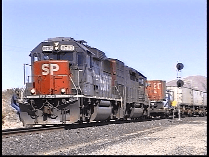 A Westbound Union Pacific TOFC/ COFC move quickly advances from the Small Siding. The Engineer immediately applies dynamic brakes on this downgrade. Southern Pacific 9783 (GP60) and Cotton Belt 9404 (SD45T-2). The 9404 was the last SD45T-2 “Tunnel Motor” ever built. Train designation is I-EWLA. It is an Intermodal from Englewood Yard (Houston) to Los Angeles.