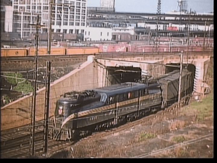 A Pennsylvania GG-1 pulls its train out of the vast Sunnyside Yard.