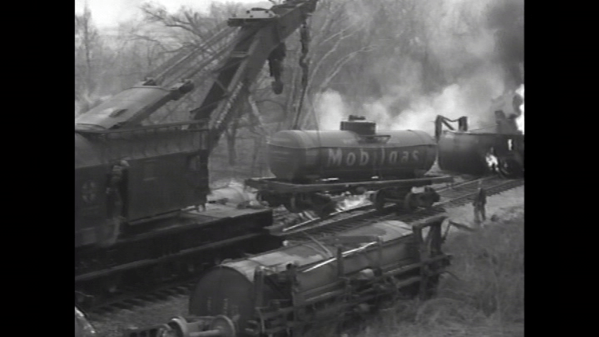 Santa Fe wreck on April 10, 1936 at Olathe, Kansas. There were 25 tank cars. Some filmed were still on fire. Here is a Santa Fe crane lifting a Mobilgas tank car.